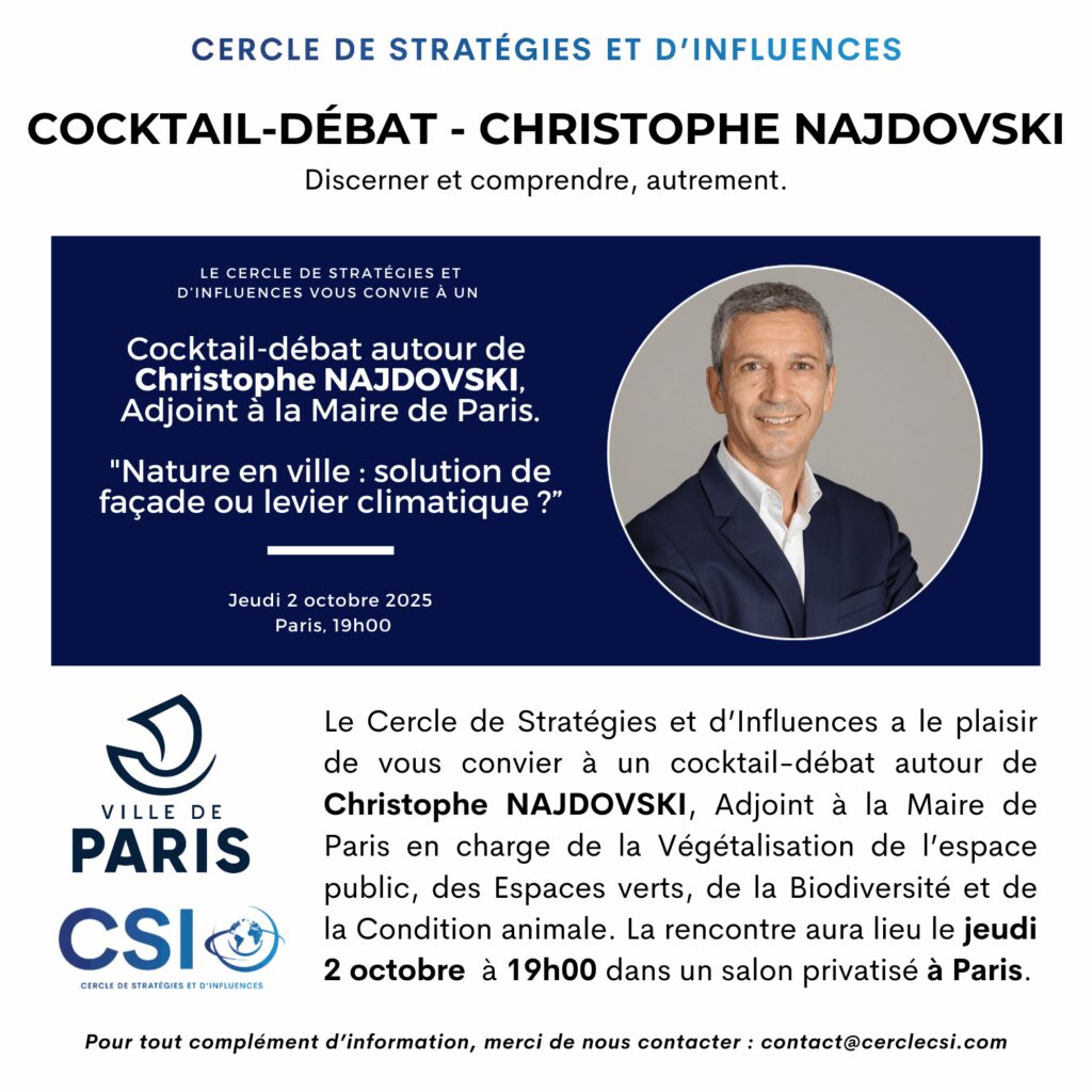 Le jeudi 2 octobre 2025, le CSI – Cercle de Stratégies et d’Influences aura le plaisir de vous convier à un cocktail-débat autour de Christophe Najdovski, Adjoint à la Maire de Paris en charge de la Végétalisation de l’espace public, des Espaces verts, de la Biodiversité et de la Condition animale.