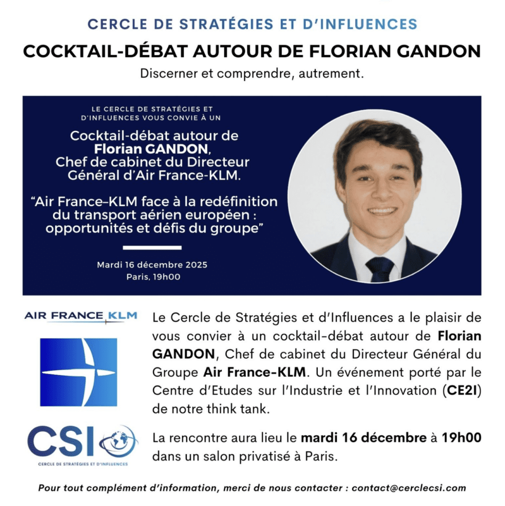 Le CSI – Cercle de Stratégies et d’Influences a le plaisir de vous convier demain soir, le mardi 16 décembre, à un cocktail-débat autour de Florian Gandon, Chef de cabinet du Directeur Général du Groupe Air France-KLM.