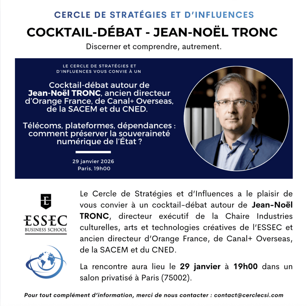 Le CSI – Cercle de Stratégies et d’Influences a le plaisir de vous convier le jeudi 29 janvier à un cocktail-débat autour de Jean-Noël Tronc, Directeur de la Chaire Industries culturelles, arts et technologies créatives de l’ESSEC, ancien directeur d’Orange France, de Canal+ Overseas, de la SACEM et du CNED. La rencontre se tiendra à 19h00, dans un salon privatisé à Paris (75002).