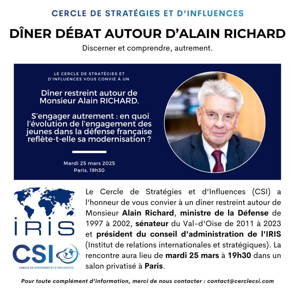 Le Cercle de Stratégies et d’Influences a le plaisir de vous convier le mardi 25 mars à un dîner restreint autour de Monsieur Alain Richard. Ministre de la Défense de 1997 à 2002 et sénateur du Val-d’Oise de 2011 à 2023, il est le mercredi 27 juin le signataire du décret ayant mis fin par anticipation au service militaire. Par ailleurs, notre intervenant est aussi président du conseil d’administration de l’Institut de relations internationales et stratégiques (IRIS).